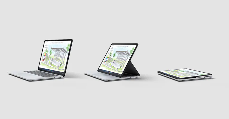 除了最常规的笔记本形态,还支持所谓的「画架模式」和「工作室模式」。