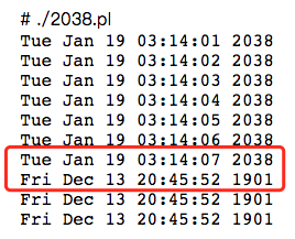 问题发生在2038年1月19日 3点14分7秒的下一秒。这一天的03:14:08不会到来,迎接你的将会是1901年12月13日20:45:52。