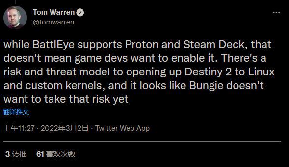 Bungie 目前并未对此作出其他解释和声明。 Verge 编辑 Tom Warren 在推特上说道:“虽然 BattlEye 支持 Proton 和 Steam Deck,但这并不意味着游戏开发者就会想要启用它。想 Linux 和自定义内核开放《命运2》存在风险和威胁模型,看来 Bungie 并不想冒这个险。”