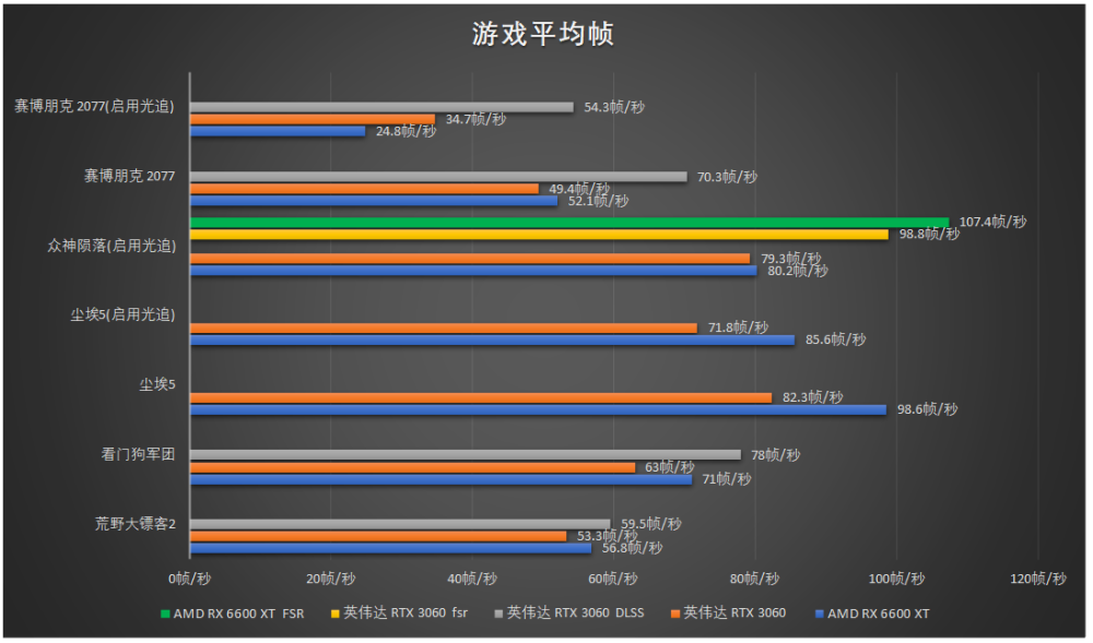 下图是英伟达RTX 3060与AMD RX 6600 XT在6款游戏中的平均帧。测试平台是AMD R7 5800X处理器,芝奇DDR4 3600MHz 32GB内存,Windows 10专业版64位操作系统,并且已将显卡驱动更新到了最新版本。从测试的结果来看AMD RX 6600 XT优势相当明显,6款游戏中有5款游戏的平均帧都超过了RTX 3060,只有在赛博朋克2077中落后了。但RTX 3060功能更多而且抗压能力也比RX 6600 XT更好。