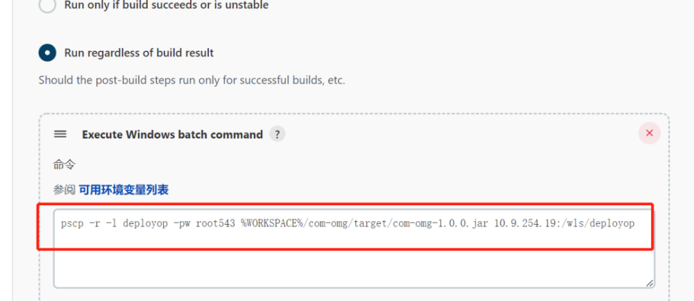 第一次在 jenkins 执行上面的命令时会失败,提示需是否要缓存用户的登录信息。只要在 Jenkins 服务所在的 Windows 系统中打开 cmd 窗口执行一下 pscp 命令,上传任意一个文件到 Liunx 系统的任意目录,根据提示输入Y。把这个任意文件上传到 Linux系统之后,再去jenkins构建就不会在出现错误了。