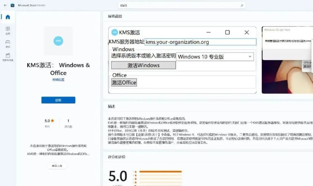 一款名为《KMS激活:Windows&Office》的工具上架微软Windows商店。KMS(密钥管理服务)激活的方式以盗版的身份为大众熟知,不过盗版是通过假冒KMS服务器进行激活,KMS本身是一种正规的激活方式。
