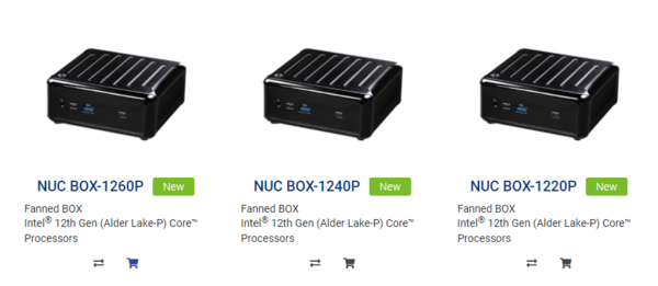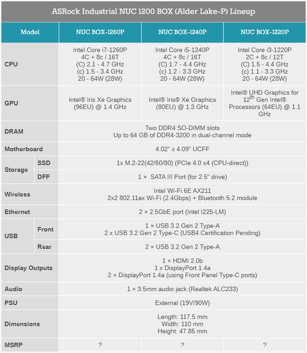 华擎推出NUC 1200 Box系列提供三款型号,机身尺寸为110.0×117.5×47.85mm,重量约一公斤。使用热设计功耗为28W处理器,分别是NUC Box-1260P(酷睿i7-1260P,12核16线程)、NUC Box-1240P(酷睿i5-1240P,12核16线程)、NUC Box-1220P(酷睿i3-1220P,10大12线程)。