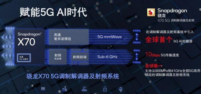骁龙 X70 是全球首款全频段 5G 调制解调器及射频系统,支持从 600MHz 到 41GHz 的全部 5G 商用频段,并且支持高达万兆级(10Gbps 5G)的传输速度。
