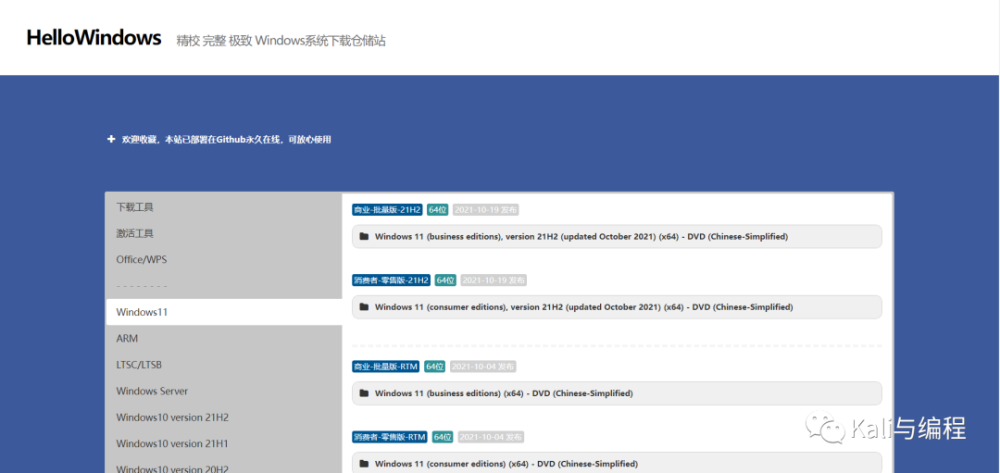 HelloWindows是一个Windows系统的下载站,从XP到Win11,大部分的系统版本都涵盖,网站界面也很干净,把系统的各个版本都列了出来,同时包含了office相关的版本。推荐大家收藏和学习!