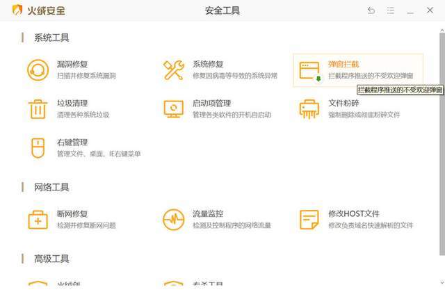 除了常规的病毒防护功能,火绒还具备「弹窗拦截」,「文件粉碎」等一系列应对流氓程序的实用功能,便于用户快捷地清除广告和顽固的文件残留。