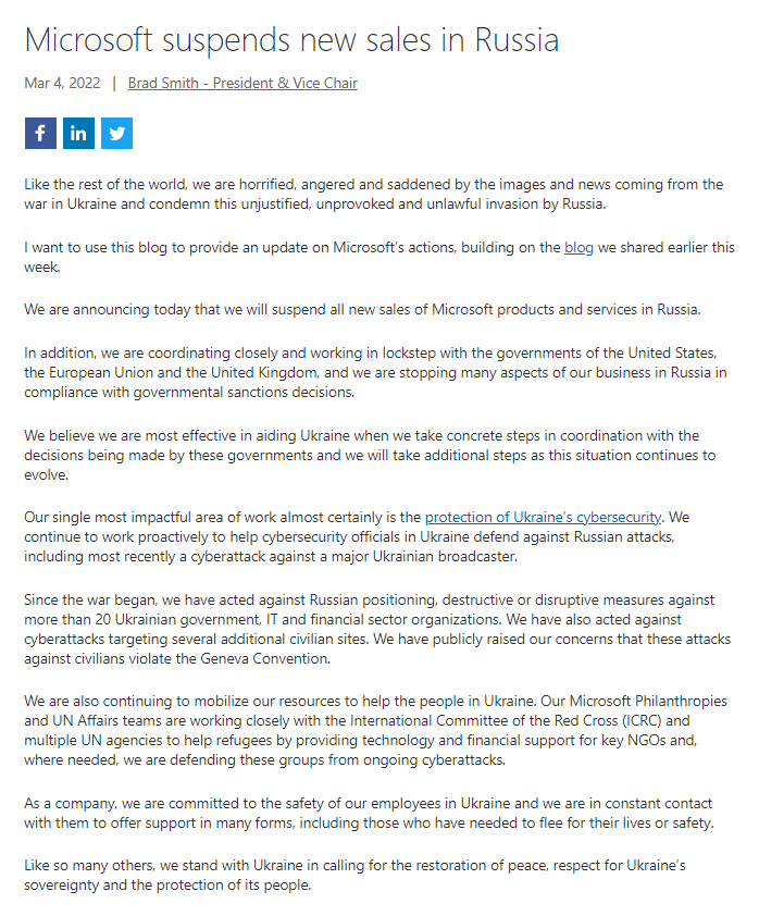 - 2022-03-05 微软宣布暂停在俄罗斯销售所有新