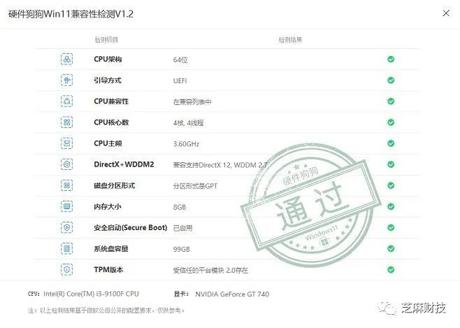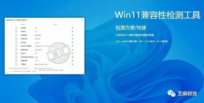 1、首先在电脑中下载第三方的Win11硬件兼容检测工具。小伙伴们可以在下方 芝麻科技讯的 小号「芝麻财技」公众号后台发消息回复「win11兼容检测」自动获取下载地址。