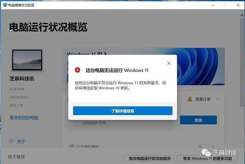 这款官方推出的「电脑健康状况检查工具」,大小超过了 13MB,使用相对简单。但如果你的电脑不支持安装Win 11的话,工具并不会提示原因,点击下方的“了解详细信息”只是会跳转到官网介绍页面,并不会直接给出具体的原因,体验上并不友好 。