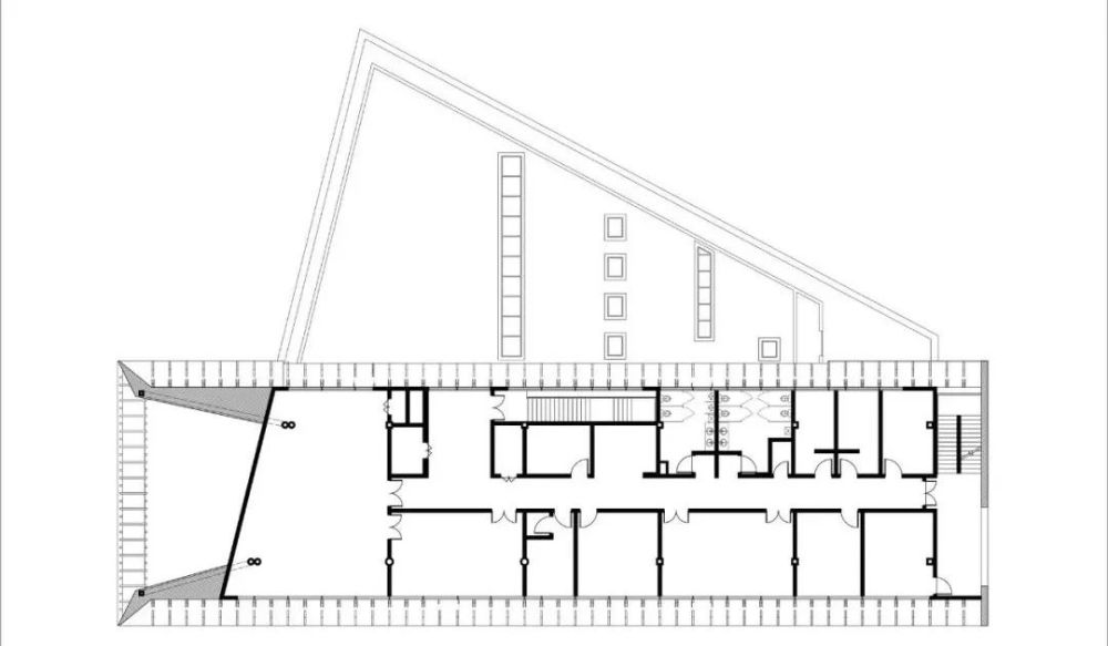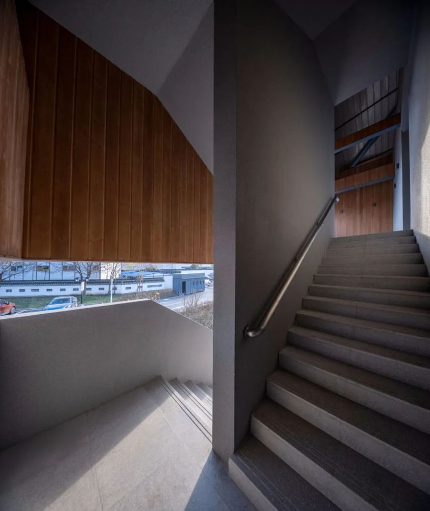 The first floor is used as offices of tourist management and service. The form of overhanging timber frame brings the building an identity that is not only visual but also a material and technological conversation with those historical buildings in the old town, whose facades are always featured by timer windows, doors, planks, and components.