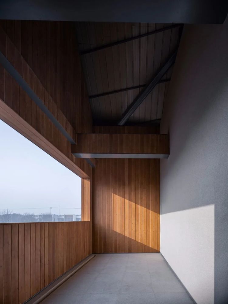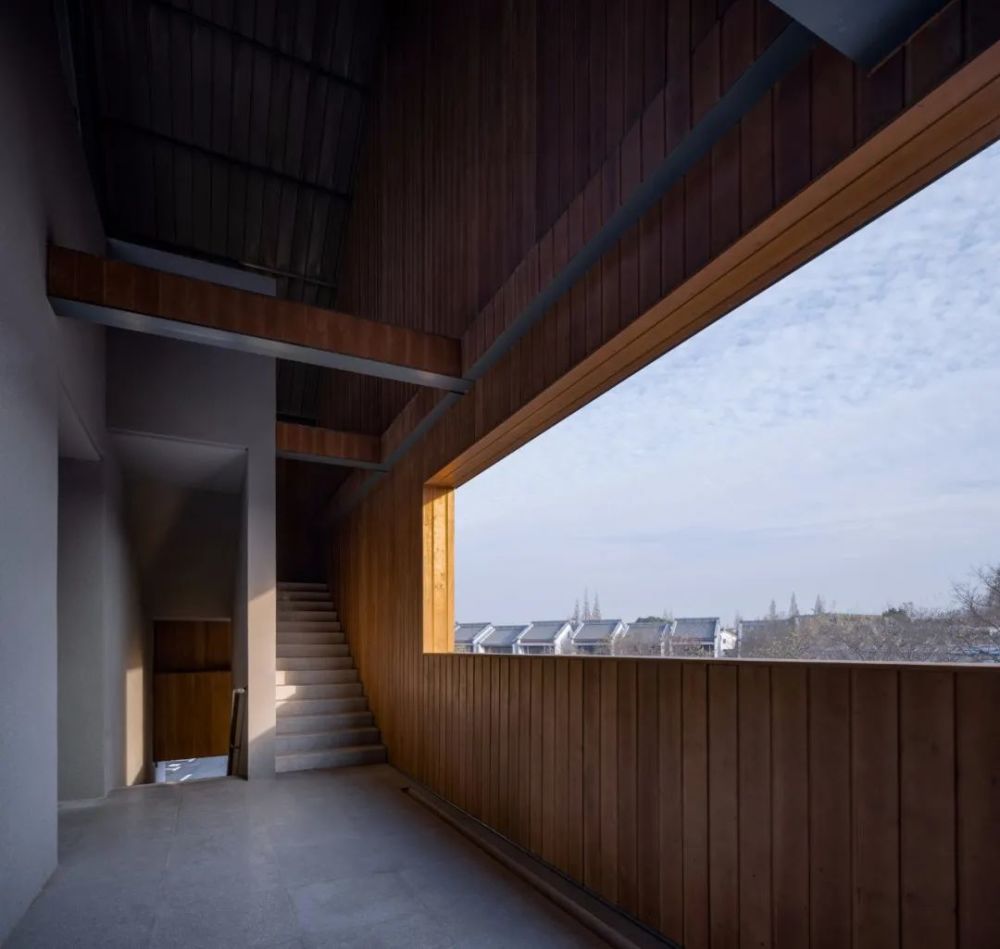 建筑一层的功能主要是旅游管理用房。建筑外墙采用了悬挑的胶合木构架,它形成了一个具有识别性的建筑外观。另外,它也与朱家角古镇中那些老建筑中常见的木门窗和外墙展开对话,体现了不同时代的技术与材料的转变。