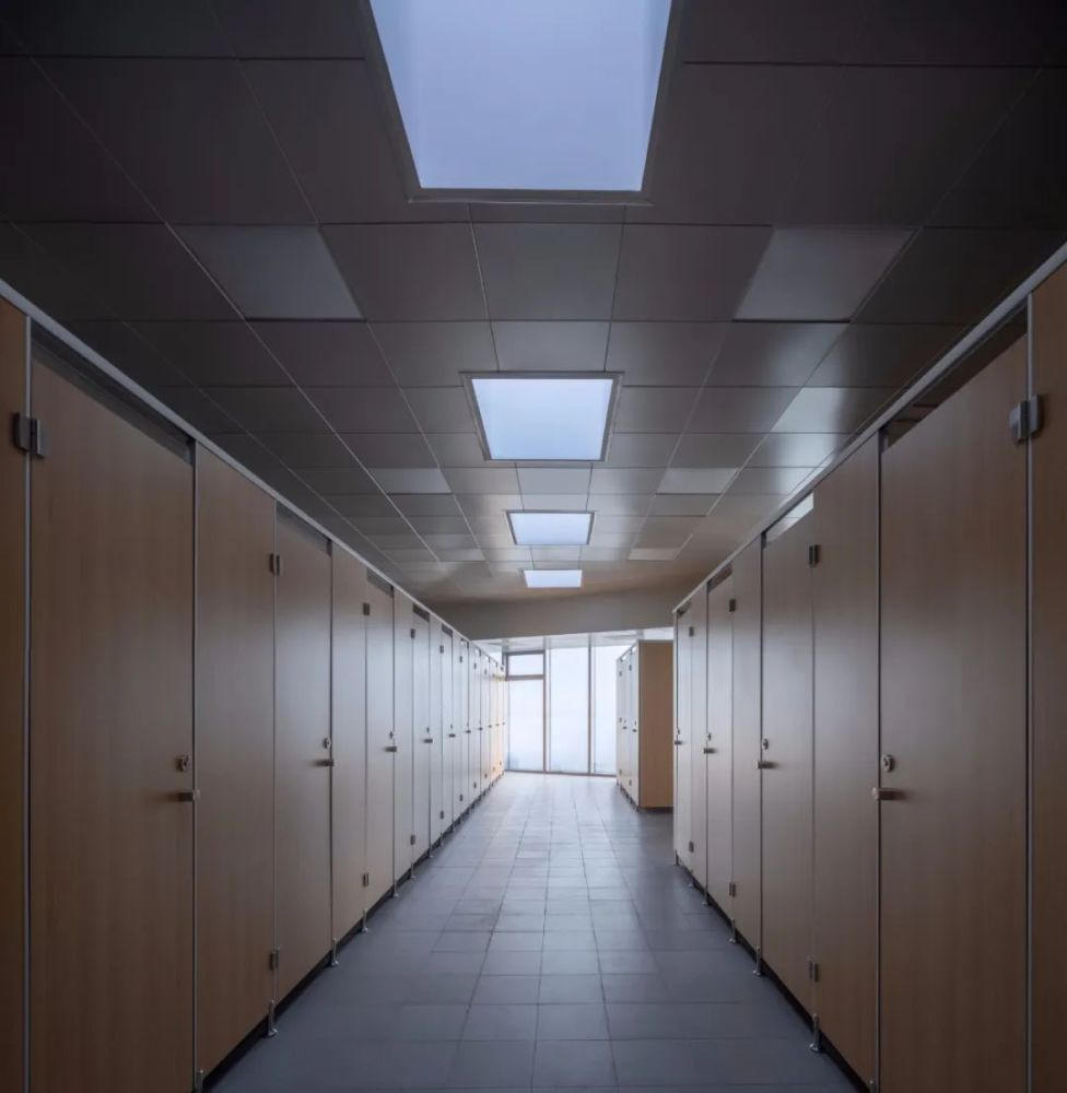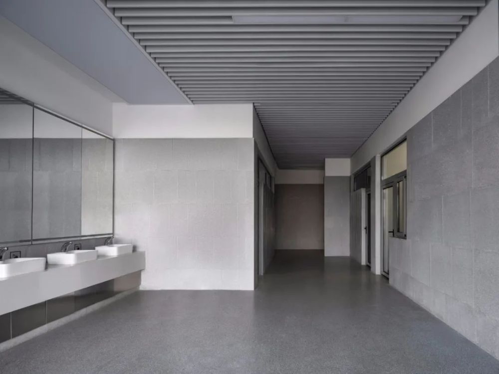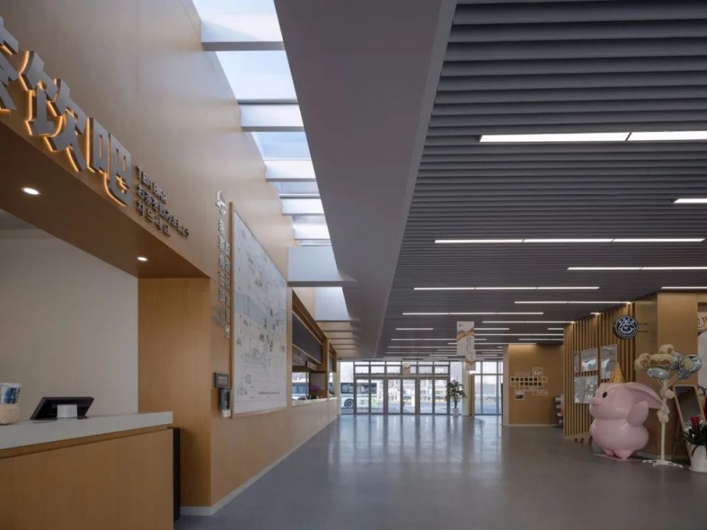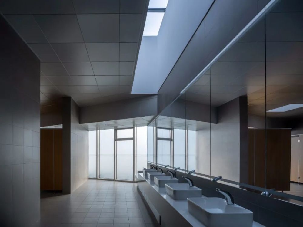 游客服务大厅主要提供售票、咨询、休息、纪念品等服务。在服务台上方设计了采光天窗,给内部空间带来更多的自然光线。公共卫生间符合AAA级旅游厕所标准,配备有公共洗手区、家庭卫生间和母婴室。卫生间内部也设计了天窗,尽量引入自然光线,避免公厕给人阴暗潮湿的感受。