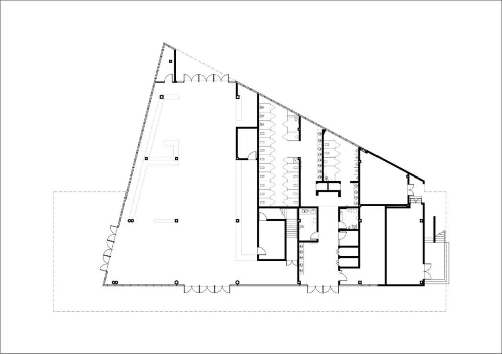 The roof made by metal cladding system is given the color of dark gray and the shape of ramp roof to achieve the building regulation of historical area. To reduce the scale of the new building, the ramp roof is transformed into a composition of two triangle parts.