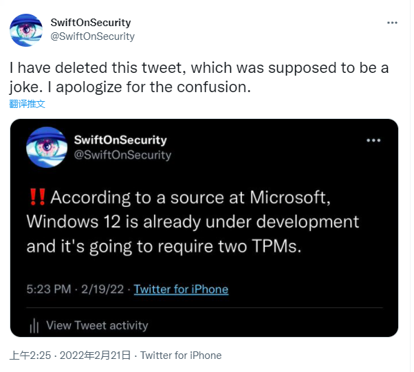 2022年2月19日,微软 MVP 专家 Swift on Security 发布了一条推文表示,Windows 12正在开发中,同时还在推特上声称,“根据微软的消息来源,Windows 12已经在开发中了,它将需要两个 TPM。”