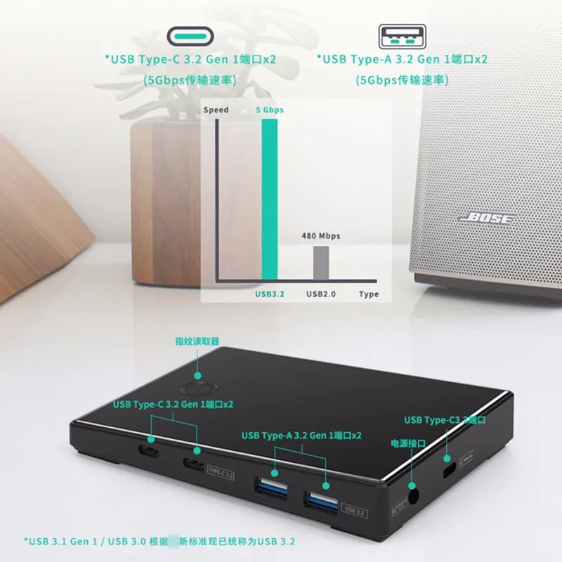此外还可同时连接使用键鼠、硬盘、U盘、风扇、手绘板、打印机等设备,支持高达5Gbps的文件传输速率。