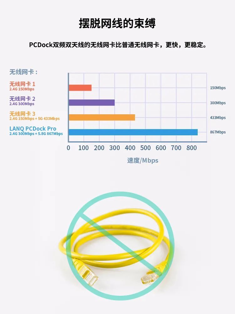 PCDOCK扩展坞采用新一代802.11ac无线传输协议,WiFi无线速率高达1200Mbps,坐拥千兆网络,4K观影视频直播抢购秒杀不在话下。
