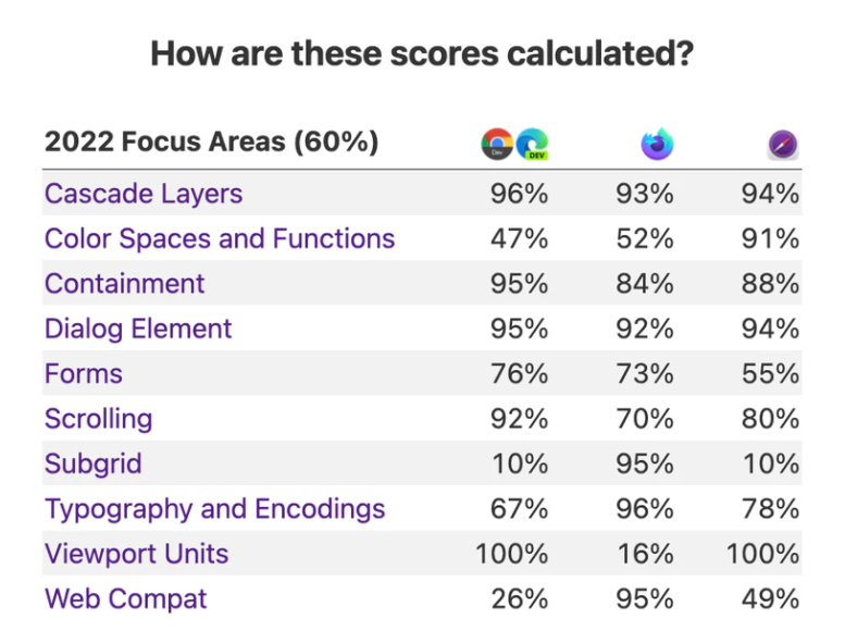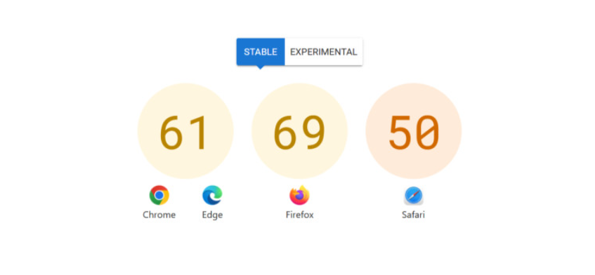 开发人员和用户可以在 Interop 2022 仪表板查看 Chrome、Edge、Safari 和 Firefox 的一致性进展,该页面显示了每个浏览器的兼容性分数。