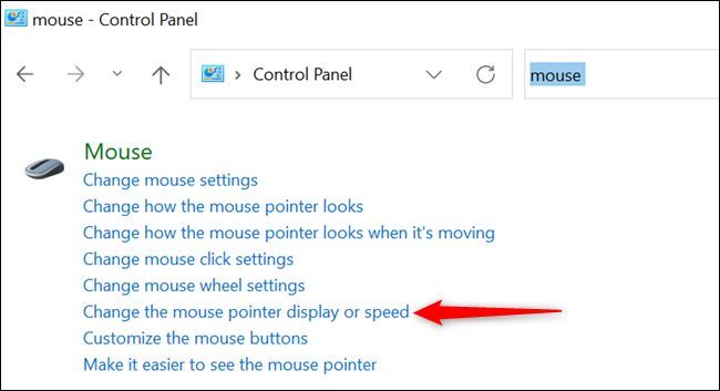 运行搜索后,单击“更改鼠标指针显示或速度”。