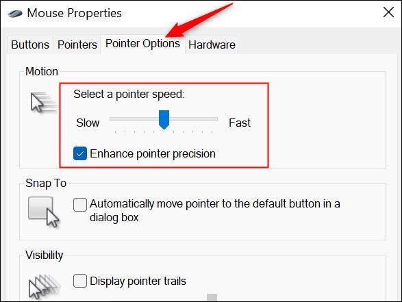 单击鼠标属性窗口中的“指针选项”选项卡,然后根据自己的喜好调整标有“选择指针速度”的滑块。您现在可以关闭鼠标属性窗口和控制面板。
