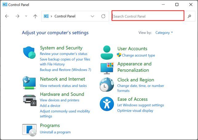 单击“控制面板”窗口右上角的搜索栏,然后键入“鼠标”。