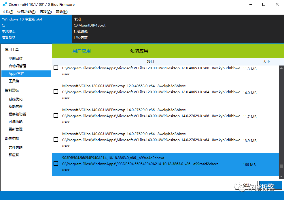 Windows 10自带了大连APPX应用,但其中多数是大家用不到的,可以通过DISM++的Appx管理功能将其删除,释放存储空间。