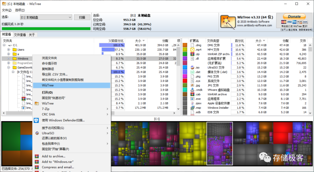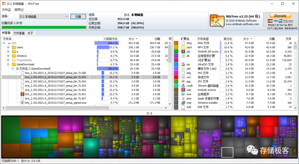 WizTree根据文件扩展名对文件进行分类,并用大小不一的色块来展现文件体积大小。方便用户找到侵吞您固态硬盘宝贵存储空间的僵尸文件,迅速对其进行删除释放。