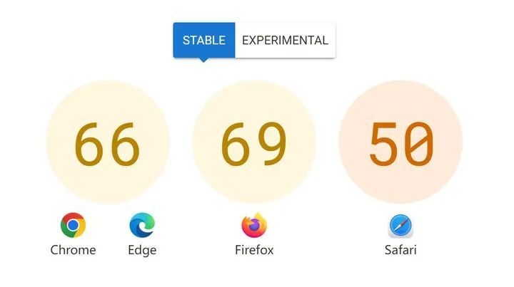 开发者版中纠正了其中一些困难,Interop 2022也计算了开发者的得分,Safari的得分为73分,在稳定版本中,该得分大大落后,但现在的得分超过了另外两个铬内核浏览器。