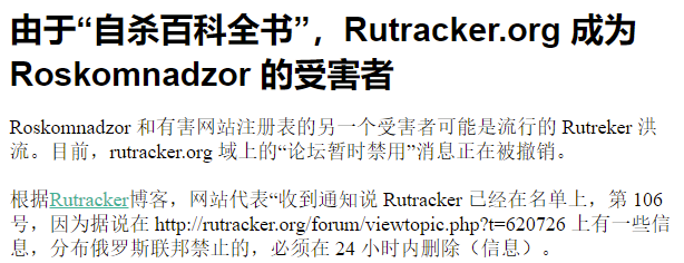 例如,2012年,RutTracker的资源(称为自杀百科全书)被上传,吸引俄罗斯监管者注意其彻底禁止。