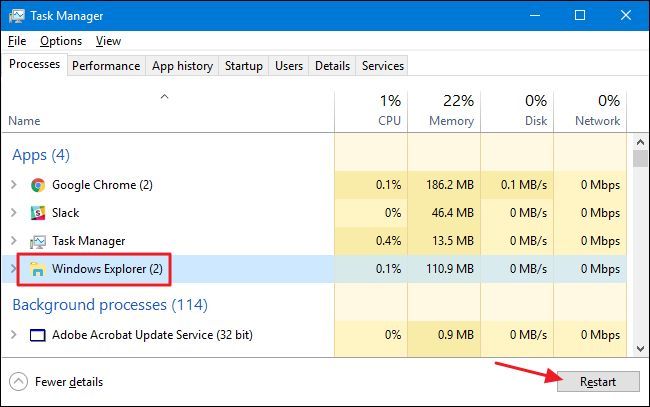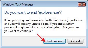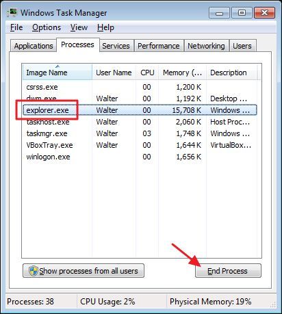 这就是你应该做的。这可能需要几秒钟, 你的任务栏和开始菜单, 除其他外, 可能短暂消失, 但是一旦恢复, 一切都会好起来的, 你可以离开任务经理。