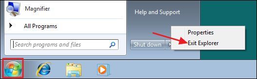 要在 Windows 7 中显示“ 退出资源管理器” 逗号,请单击“ 启动”, 按住 Ctrl+Shift, 并单击 Start 菜单中的任何可用位置。