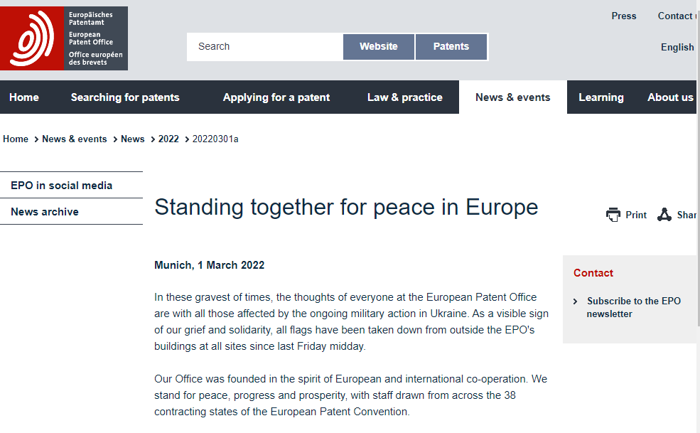 3月1号,根据欧洲专利局网站,欧洲专利组织已决定立即停止与俄罗斯联邦、白俄罗斯国家专利局和欧亚专利组织的合作。并在稍后阶段,与38个会员国、推广国和观察员一道,审查和审议进一步可能采取的行动和所涉问题,筹备即将举行的执行委员会会议。