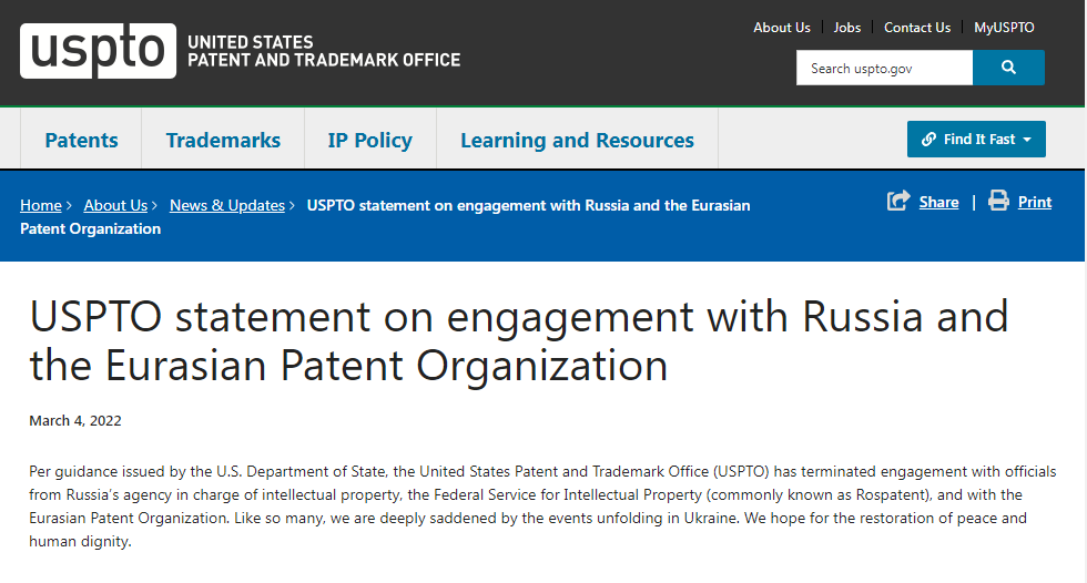 3月4号,根据美国专利和商标局网站(USPTO),根据美国国务院的指导方针UPSTO结束了与俄罗斯知识产权机构的关系,包括联邦知识产权办公室(又称Rospatent)和欧亚专利组织的官员。