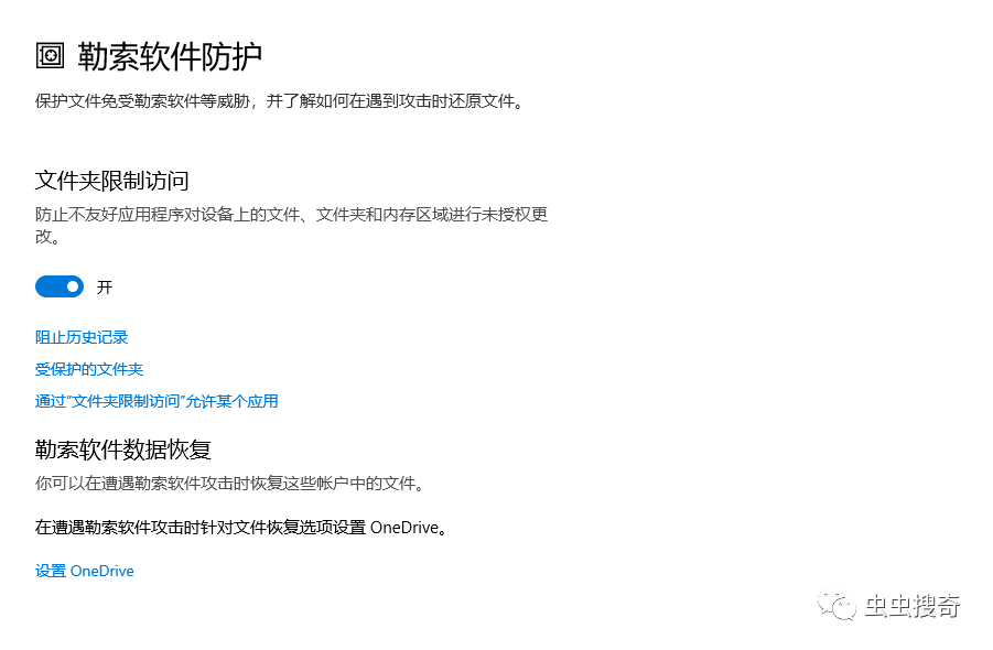 这可以从WD接口启动。只要搜索Windows安全中心,导航到病毒和威胁保护,在屏幕底部选择勒索程序保护,然后点击 " 配置敲诈软件保护 ",并启用 " 档案有限访问 " 。