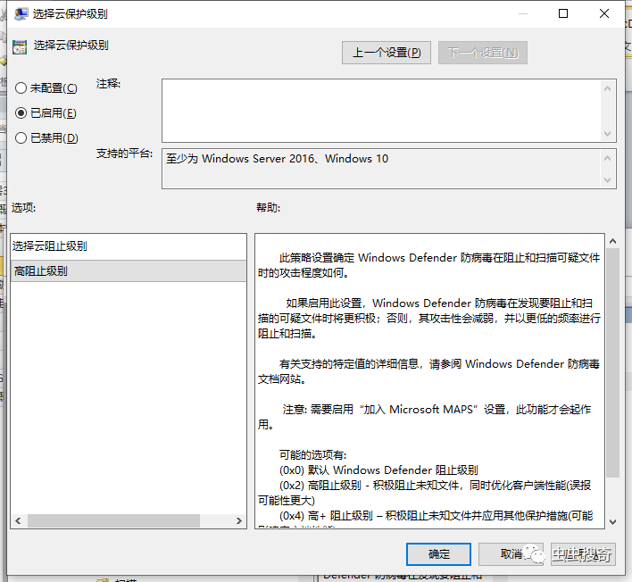 选择“ 选择云层保护级别” 选项, 激活它, 并将选择设置为高区块级别 。 此选项将允许 Windows Defense 反病毒软件在识别可疑文件时更加积极主动 。