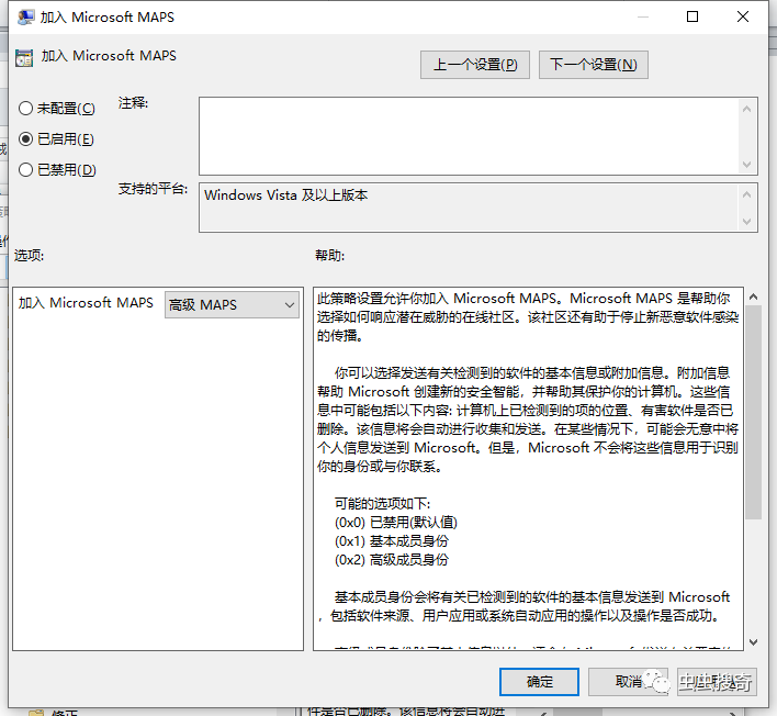 在本地组策略编辑器中导航到:计算机配置> 管理模板> Windows 组件> Windows Defender防病毒> Maps。打开添加 Microsoft MAPS 选项对话框,并切换要启用的设置。在可能性列表中,从下拉菜单中可以选择 MAPS 级别 。成员资格可以是基本成员,也可以是高级成员。