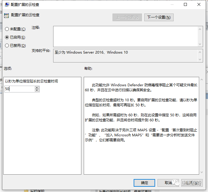 最后,它被激活, 在配置扩展云检查中时间设定为 50。 正常的云检查超时为 10 秒。 要启用扩展的云检查功能, 请指定以秒计的延长时间, 最长延长时间为 50 秒 。