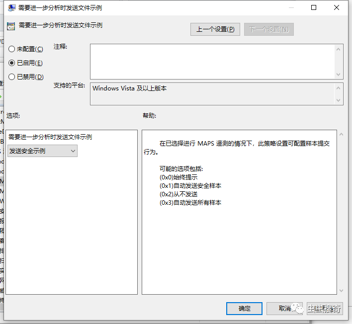 启用。 配置本地设置替换以在需要更多分析时向 Microsoft MAPS 发送文件示例。 选择最适合您需要的选项。 建议使用“ 发送安全示例” 一词 。