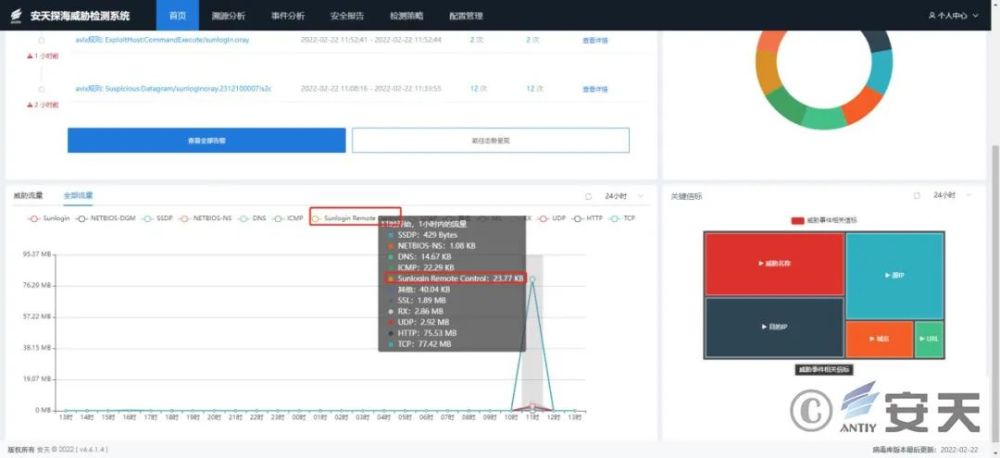 通过勘察海面,可以发现和警告使用向日葵洞的情况,在威胁事件网页的流量探测结果中可以找到具体的事件信息。