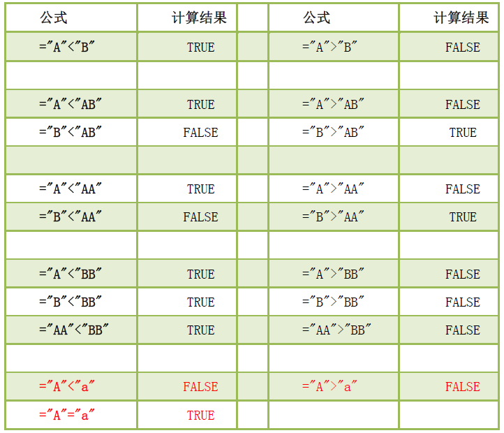 (3)文本字符型数据中汉字>字母>文本型数字>文本型空格,比较过程中Excel不区分大写字母和小写字母