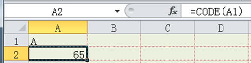 例如,当我们使用公式 = CODE(A1) 来获取文本类型 A 字符的代码值时,我们得到的结果是65个,这与上表的数字相符。