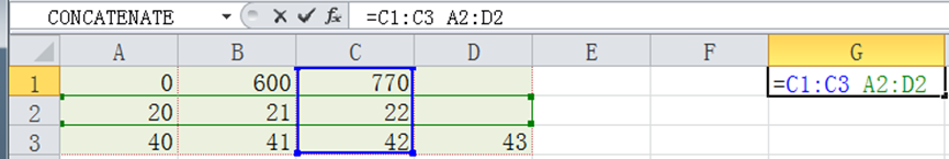 上述公式包括一个空间,即在参考操作器中,只有一个空间。它意味着什么?把它看作交叉匹配,或C1:C3和A2:D3的一个共同元素,答案是22。
