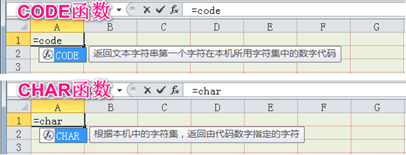 当然,如果你记得字符的代码值, 您可以使用字符函数直接输入单元格中合适的字符, 这里有两个例子, 一个在 ASCII 代码范围内, 一个在 ASCII 代码范围以外 。