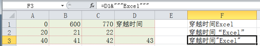 如果需要在结果中呈现出英文引号,这时就需要用两个英文引号来引用,出现=D1&"""Excel"""这种写法。