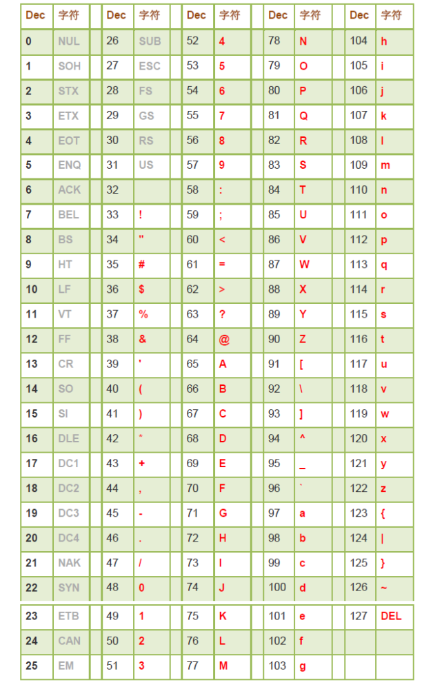 32-126:共有95个可打印字符,其中32个是空格,48-57个是0至910个阿拉伯数字,65-90个是大写字母,97-122个是小写英文字母,其余是标号符号、操作符号等等。