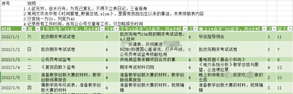 日记表格规定了每日工作时间限制(11小时),以便提供娱乐时间,尽量减少早期秃头,促进长期成长。