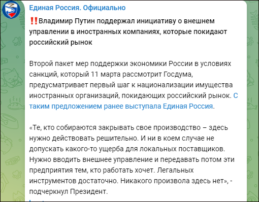 3月10日,俄罗斯联邦安全理事会副主席梅德韦杰夫先生在社交媒体上说:俄罗斯政府正在研究这些措施。面对国际企业的大规模外流,其中包括破产和将从外国公司没收的资产国有化。梅德韦杰夫强调,外国公司退出与商业无关。“纯粹是政治”,西方企业如果离开,重新进入俄罗斯市场,也将困难重重。