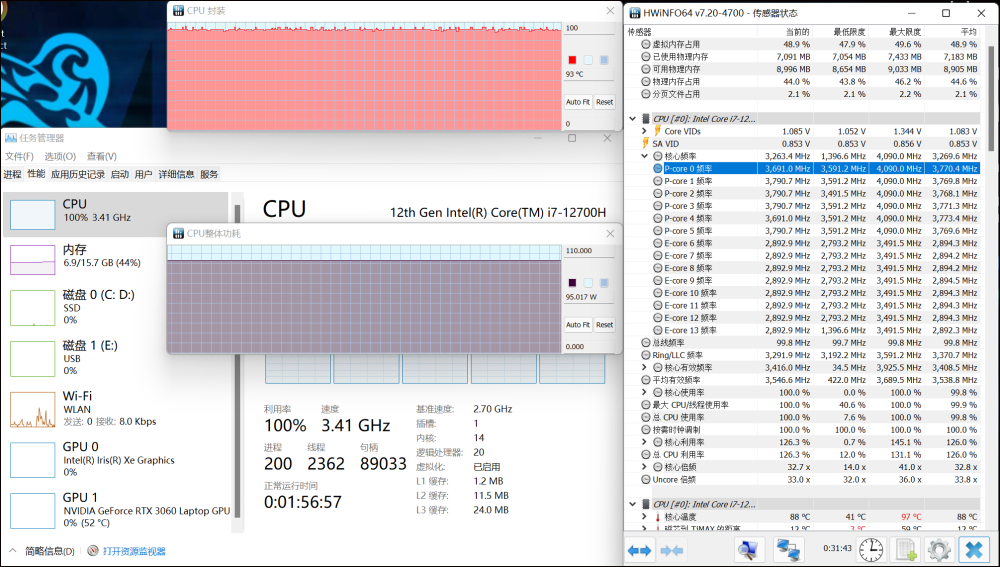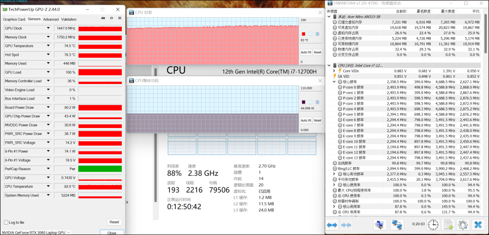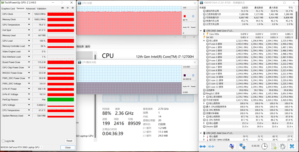 在室温25℃左右,使用Aida64和Furmark对2022年的影子骑士进行双试全载试验。半小时后,如下:i712700H CPU具有45W的封闭能力。大核频率约为2.5千兆赫。微小的核频率在2.2GHz左右温度在80°C左右,RTX 3060的功率在110到120瓦之间。频率约为1850兆赫。目前气温为76.8摄氏度。双考毫无问题,很可能是45W+115W核心电力配置全功i712700H+ RTX3060被轻度压碎。