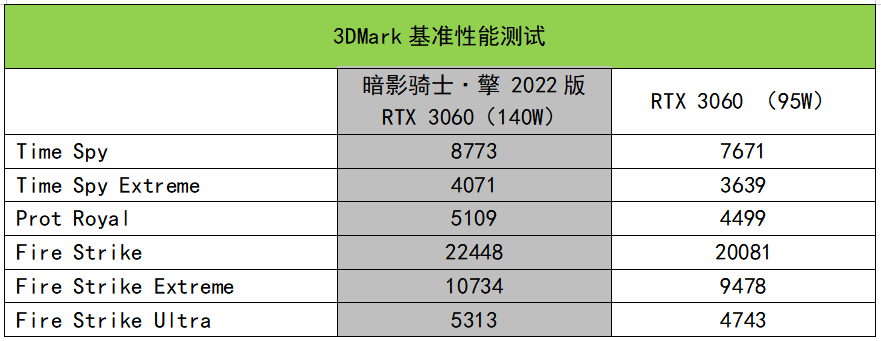 根据3DMark基准测试结果2022年版140W的RTX 3060,而上一代装置的RTX 3060为95W RTX 3060。DX11基准测试的增加范围从11%到13%不等。DX12基准测试的增加范围从11%到14%不等。轻追的性能提高了约13%。例如,时间间谍序列中的机器的卡分是8773分RTX 3060属于主流,运行得分为130W/140W。