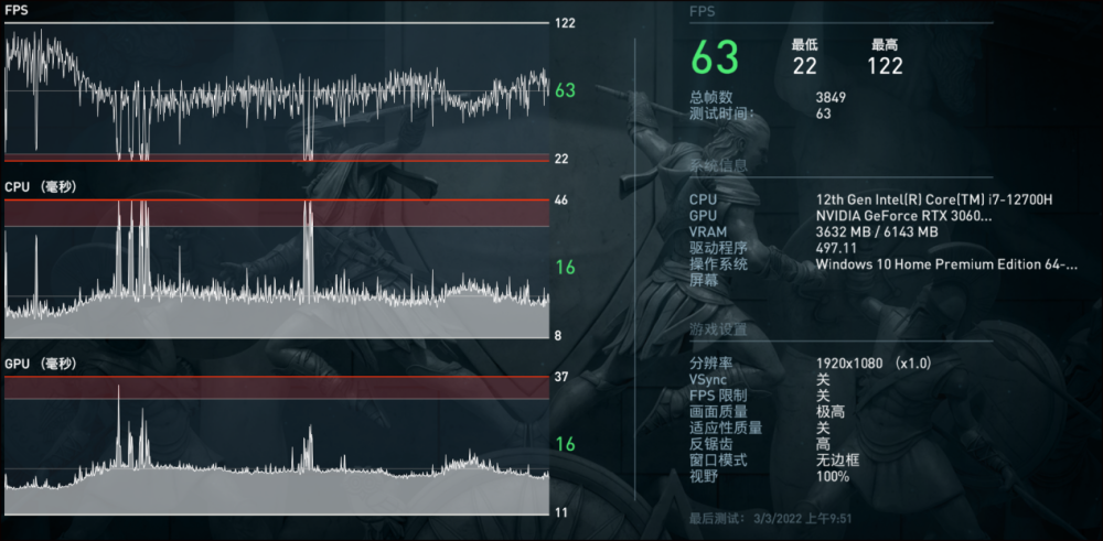 “Asassin:Odyssey”, 影子骑士2022 最大质量平均框架速度在FHD下为63fps, 通常高功率RTX 3060, 比95fps稍快。