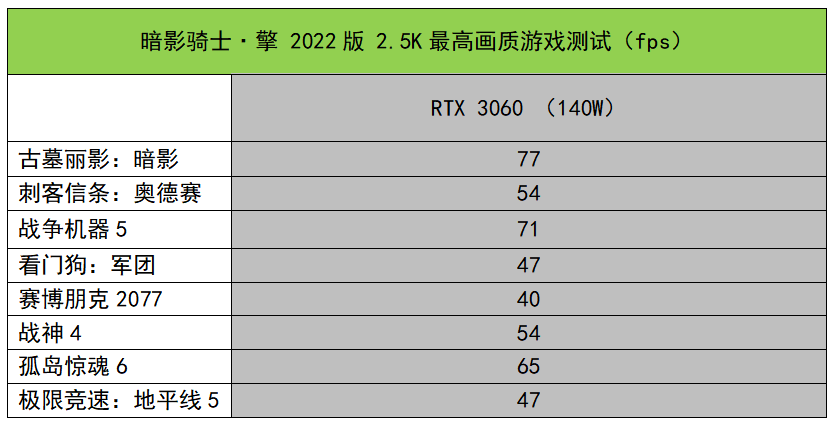 实测来看,2022年的影子骑士猪 到达了2,5K分辨率, 一台机器使用高等级液体操作。除了改善可怕的Saberpunk 2077,上述测试游戏的平均框架速率可达到每秒60框架以上。同时,95W时RTX 3060即使后者有其自身的抢劫,另一方面,140W RTX 3060远远落后。影子骑士猪2022 赢2 在500 高质量3A比赛中。稳妥。